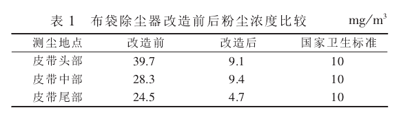 該套除塵系統(tǒng)2001-09,在新廠6號(hào)皮帶尾部安裝并投入運(yùn)行,除塵效果顯著,粉塵濃度明顯下降,經(jīng)包頭市技術(shù)監(jiān)督局現(xiàn)場(chǎng)測(cè)試_符合_標(biāo)準(zhǔn)。測(cè)試數(shù)據(jù)見表1。
