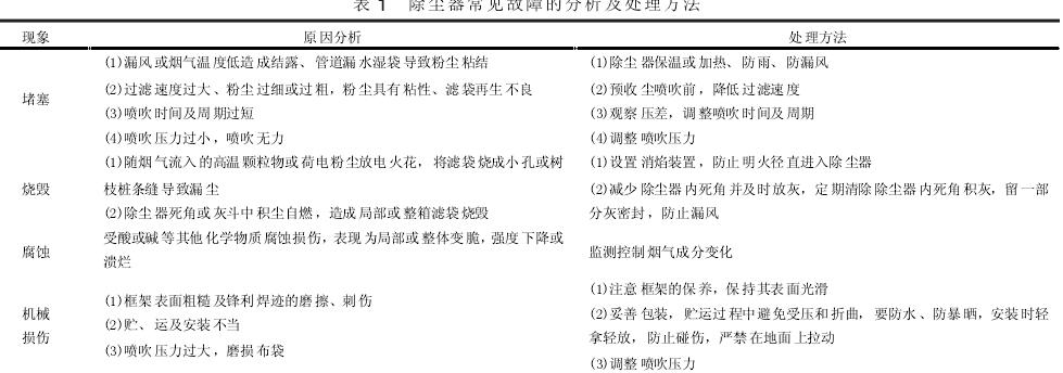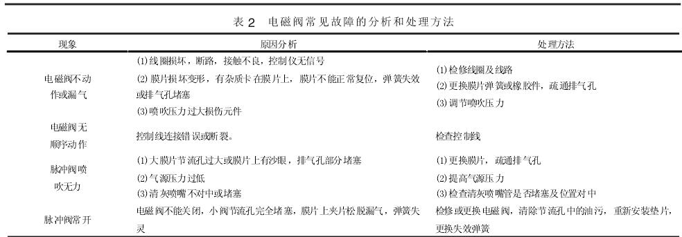 在除塵器的日常運行中,由于運行條件會發(fā)生某些改變,或者出現(xiàn)某些故障,都將影響設(shè)備的正常運轉(zhuǎn)狀況和工作性能,要定期地進行檢查和適當?shù)恼{(diào)節(jié),降低動力消耗及回收有用的物料。 同時,特別要堵住除塵器排灰口的漏風,因為在除塵器的灰斗中有大量緩慢下落的粉塵, 逆流向上的漏風氣流又造成下落粉塵的二次飛揚及多次循環(huán), 因而排灰口漏風可使除塵器內(nèi)的粉塵濃度成倍地高于入口的粉塵濃度, 這樣_惡化了除塵器的工作條件,影響了除塵效率[5] 。 除塵器常見故障的分析及處理方法見表 1,電磁閥常見故障的分析和處理方法見表 2。