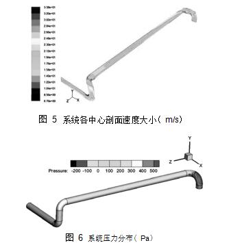 分布情況。由圖可知,系統(tǒng)速度大小為 6. 76 ~ 33. 8m /s,_值出現(xiàn)在彎頭的內(nèi)側(cè)且大于煙氣入口值,_小值出現(xiàn)在彎頭的外側(cè),直段的速度約在 19. 4 ~21. 2 m /s,壓力_值出現(xiàn)在彎頭的外側(cè),_小值發(fā)生在彎頭的內(nèi)側(cè),且_個彎頭外側(cè)壓力值明顯高