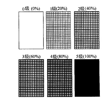 林格曼煙氣濃度圖是 19 世紀(jì)末法國(guó)的林格曼提出的。這種方法是把圖放置在適當(dāng)?shù)奈恢蒙?,使圖上的黑度與煙氣的黑度(或不透光度)相比較,憑視覺(jué)進(jìn)行評(píng)價(jià)。在工業(yè)爐窯大氣污染物排放標(biāo)準(zhǔn)中,排放限制(除非金屬焙燒爐窯外)為煙氣黑度不大于 1 級(jí)。林格曼圖有多種規(guī)格,通用標(biāo)準(zhǔn)形式是由 14c m ×21cm 的黑度不同的 6 小塊組成。除全白與全黑塊 2 外,其他 4 塊是在白色背底上畫(huà)上不同寬度的黑色條格。根據(jù)黑色條格在整修小塊中所占的面積的百分?jǐn)?shù)分成 0-5 的林格曼級(jí)數(shù): 0 級(jí)是全白, 5 級(jí)是全黑, 1 級(jí)是黑色條格占整塊面積的 20% , 2 級(jí)占 40% ,以此類推,如圖