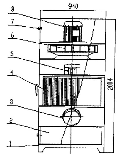 1.箱體;2.盛粉塵抽屜;3.粉塵吸入口;4.粉塵過濾布袋;5.振蕩機構(gòu);6.風(fēng)機;7.電控系統(tǒng);8.主電機
